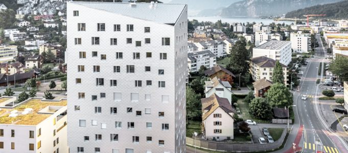 Hochhäuser, insbesondere Wohnhochhäuser, sind in der Schweiz selten. Die klassischen Hochhaus-Fassaden mit ihren stereotypen Rastern eignen sich für Bürogebäude. Das Rasterprinzip kam für Theus nicht infrage. Sie wollte „ein anderes, sympathisch wirkendes Fassadenbild“. Aus diesem Anspruch heraus entwickelte die Architektin „tanzende Fenster“, die unregelmäßig angeordnet, aber doch harmoniestiftend sind. In jeder Position – im Stehen, beim Esstisch sitzend, auf der Couch liegend – bieten die Fenster in perfekter Höhe den Blick nach außen.
