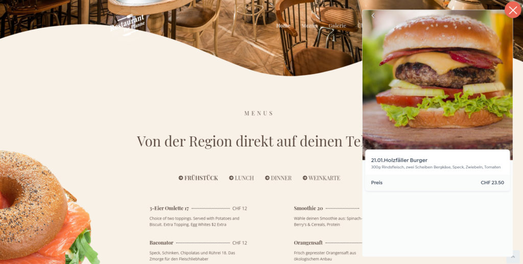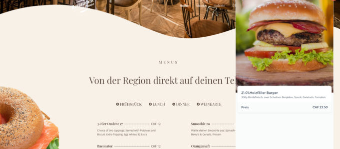 * Tages- oder Wochenmenü und falls vorhanden auch A-la-Carte-Karte mit Beschrieb und Bilder