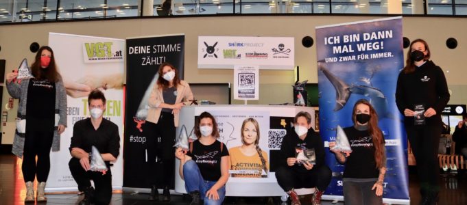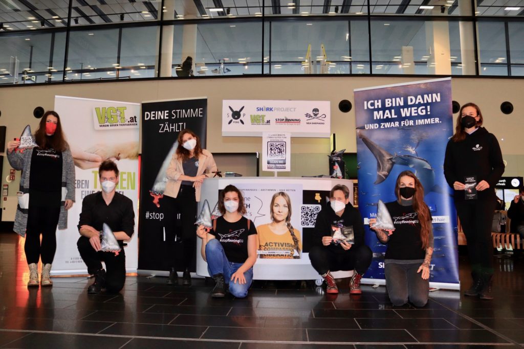Wien (pts022/13.12.2021/13:00) – Die gemeinnützige Artenschutzorganisation Sharkproject sammelte bei einer Info-Aktion am Flughafen Wien gemeinsam mit Sea Shepherd, VGT & der Influencerin Sandy P. Peng Unterschriften für die EU-Bürgerinitiative „Stop Finning – Stop the Trade“. Ziel der Initiative ist es, die „Fins Naturally Attached“-Verordnung zu erweitern und so den kompletten Import, Transit & Export loser Flossen zu verbieten. Insgesamt müssen für den Erfolg von StopFinningEU in der ganzen Europäischen Union eine Million Stimmen gesammelt werden – bis zum 31. Jänner 2022 kann man noch auf der Website der EU https://eci.ec.europa.eu/012/public/ # /screen/home unterschreiben. In Österreich haben bereits über 10.000 Menschen ihre Stimme abgegeben.